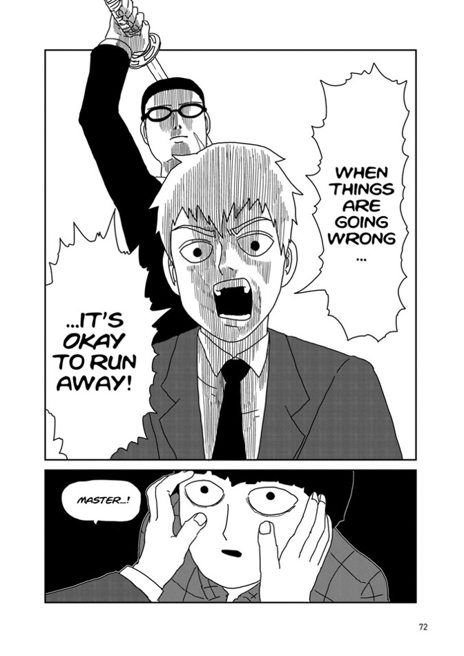 Another subversion present in MP100 occurs when Reigen tells Mob that he should run away from a fight.